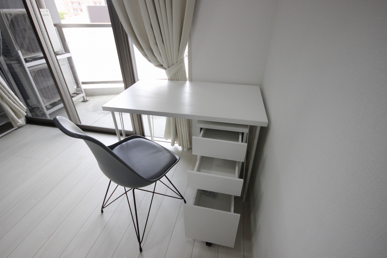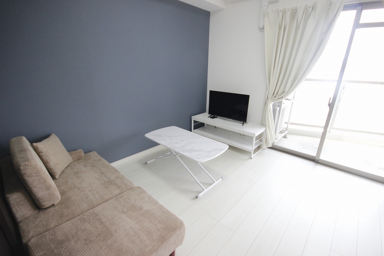 地下鉄空港線「大濠公園駅」まで徒歩圏内。天神・博多エリアへのアクセスも良好な立地でありながら、周囲には大濠公園や西公園、舞鶴公園といった自然も広がっており、静かで落ち着いた住環境が魅力です。 通勤・移動の利便性と、自然に囲まれた癒しの環境。どちらも叶うバランスの取れたエリアです。 周辺には、ローソン、ドラッグイレブン、マミーズ(スーパー)などの生活に便利なお店に加え、カフェやベーカリー、定食屋さんやイタリアンなど、飲食店も充実。ちょっとした外食や買い物にも困らず、長期滞在でもストレスを感じにくい環境が整っています。 お部屋は1LDKの間取りで、リビングと寝室をしっかり分けて使える設計。約9帖のリビングにはブルーのアクセントクロスを取り入れ、清潔感の中にやさしい爽やかさが感じられる空間になっています。 家具はホワイト〜アイボリー系で統一され、広々とした室内をより明るく見せてくれます。 テレビ台とリビングテーブルはマーブル調の柄が施されたデザインで、上品さと高級感をプラス。ブルーの壁と調和し、シンプルながら洗練されたコーディネートとなっています。 家電も一通り揃っており、テレビ・冷蔵庫・電子レンジ・電気ケトル・洗濯機・掃除機などが完備。さらにWi-Fiも利用可能なため、到着したその日から快適な生活がスタートできます。 デスクやチェアも設置済みで、テレワークや勉強、リモート会議などにも対応しやすく、仕事との両立にも◎。 キッチンには調理器具・食器類も備えており、自炊派の方も安心。清掃やメンテナンスも行き届いた空間で、短期滞在から中・長期利用まで、安心してお過ごしいただけます。