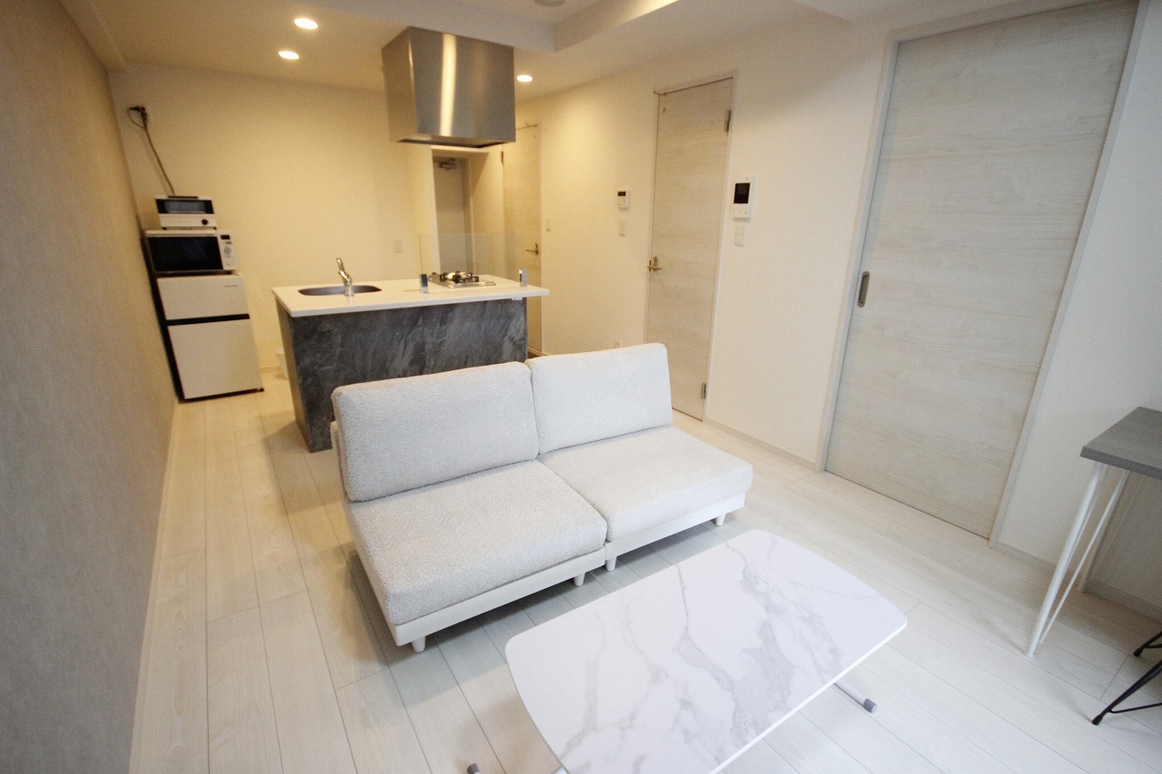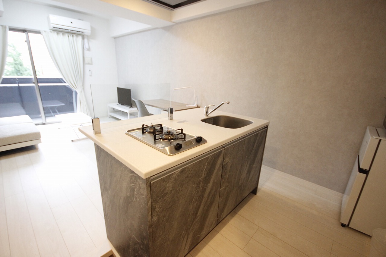 【ルームイン大濠プレミア】こちらのお部屋は、福岡市中央区大濠エリアにある、ゆったりとした1LDKタイプのマンスリーマンションです。落ち着いた場所にありながら、都心部へのアクセスもスムーズな好立地で、長期滞在にとても便利な一室です。 本物件の最大の特長は、お部屋の中心に配置された「アイランドキッチン」。開放感のあるデザインで、壁に向かって料理をする従来のキッチンとは異なり、リビングと一体感のある空間を演出します。料理をしながらテレビを見たり、家族やパートナーと会話を楽しんだりと、ライフスタイルにゆとりをもたらしてくれます。2口のガスコンロ付きで、本格的な調理も可能。長期滞在や自炊メインの方にもおすすめです。 家具は、アイボリー(白)とグレーを基調としたやさしいトーンで統一されており、明るくナチュラルな雰囲気の中でリラックスした毎日をお過ごしいただけます。ベッドはセミダブルサイズを採用し、寝室はしっかり個室として確保されているため、プライバシーを保ちつつ快適な空間分けが可能です。デスクとチェアも完備しており、テレワークやちょっとした作業にも対応できます。 周辺環境も魅力のひとつです。最寄りの地下鉄「大濠公園駅」まで徒歩約3分、天神・博多方面へも電車一本でアクセス可能。バス停も近く、移動手段の選択肢が豊富です。徒歩圏内には「マックスバリュ港町店」や「ドラッグイレブン港店」、おしゃれなベーカリーやカフェ、昔ながらの定食屋など、日常の買い物にも外食にも困らない便利な環境が整っています。 また、大濠公園や舞鶴公園といった福岡を代表する自然豊かなスポットが近く、休日にはお散歩やジョギングを楽しむこともできます。春には桜、夏には水辺の涼しさなど、四季折々の表情が生活に彩りを添えてくれます。 都心に近く、自然も感じられるエリアで、生活・通勤・リラックスのバランスがとれた暮らしを実現できる「ルームイン大濠プレミア」。マンスリーマンションとして、仮住まい、転勤、出張、一時帰国など、様々な用途におすすめの物件です。