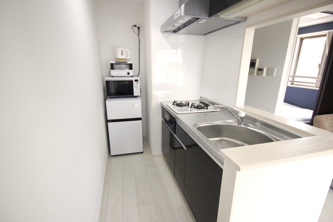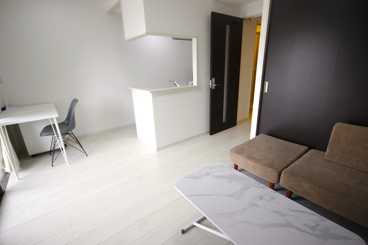 地下鉄空港線「大濠公園駅」まで徒歩圏内。天神・博多エリアへのアクセスも良好な立地でありながら、周囲には大濠公園や西公園、舞鶴公園といった自然も広がっており、静かで落ち着いた住環境が魅力です。 通勤・移動の利便性と、自然に囲まれた癒しの環境。どちらも叶うバランスの取れたエリアです。 周辺には、ローソン、ドラッグイレブン、マミーズ(スーパー)などの生活に便利なお店に加え、カフェやベーカリー、定食屋さんやイタリアンなど、飲食店も充実。ちょっとした外食や買い物にも困らず、長期滞在でもストレスを感じにくい環境が整っています。 お部屋は1LDKの間取りで、リビングと寝室をしっかり分けて使える設計。約9帖のリビングにはブルーのアクセントクロスを取り入れ、清潔感の中にやさしい爽やかさが感じられる空間になっています。 家具はホワイト〜アイボリー系で統一され、広々とした室内をより明るく見せてくれます。 テレビ台とリビングテーブルはマーブル調の柄が施されたデザインで、上品さと高級感をプラス。ブルーの壁と調和し、シンプルながら洗練されたコーディネートとなっています。 家電も一通り揃っており、テレビ・冷蔵庫・電子レンジ・電気ケトル・洗濯機・掃除機などが完備。さらにWi-Fiも利用可能なため、到着したその日から快適な生活がスタートできます。 デスクやチェアも設置済みで、テレワークや勉強、リモート会議などにも対応しやすく、仕事との両立にも◎。 キッチンには調理器具・食器類も備えており、自炊派の方も安心。清掃やメンテナンスも行き届いた空間で、短期滞在から中・長期利用まで、安心してお過ごしいただけます。